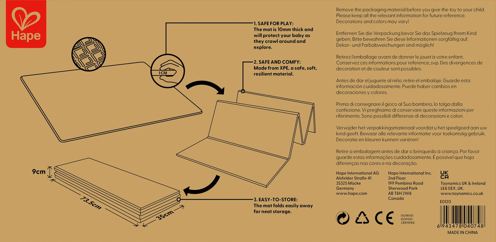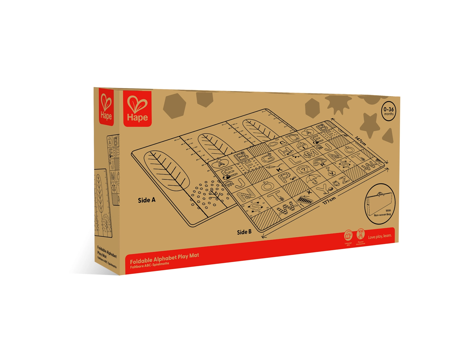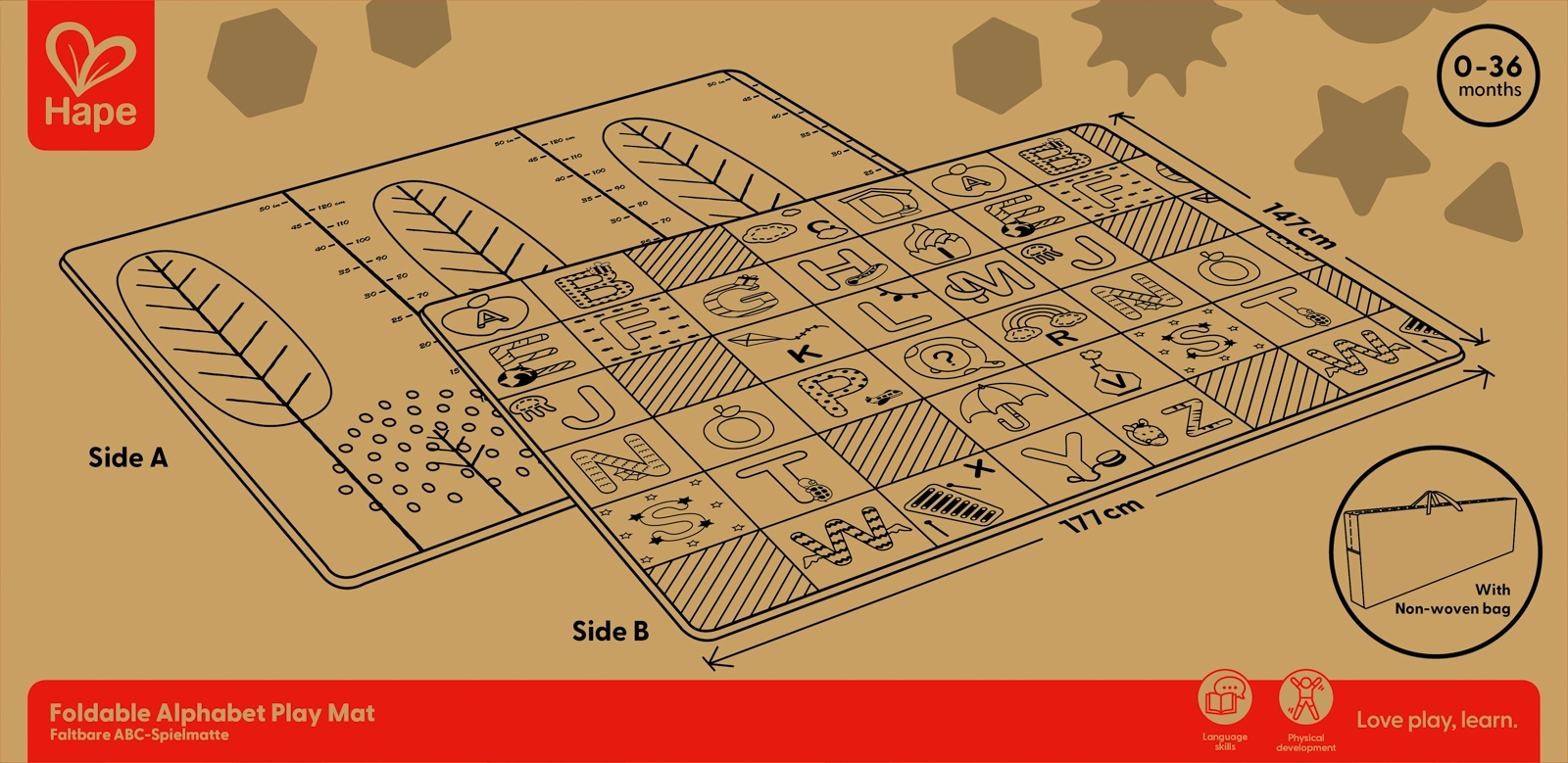 Ta zložljiva podloga HAPE otrokom nudi varno in udobno mesto za prve korake v svet. Radodarne mere 147 × 177 × 1 cm zagotavljajo dovolj prostora za igro, medtem ko dvostranski dizajn združuje izobraževalno abecedo s praktično merilno lestvico višine za zabavno spremljanje rasti.