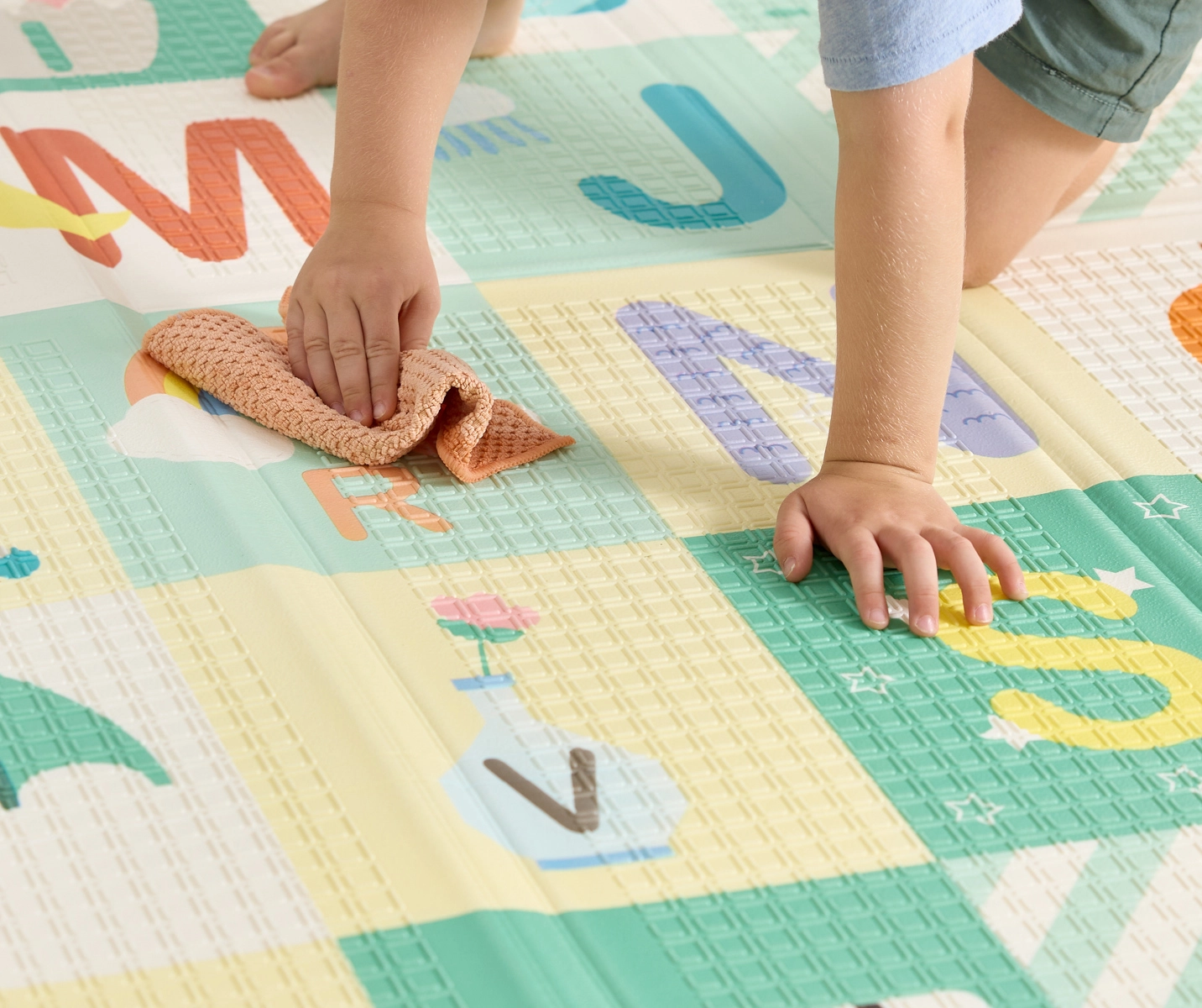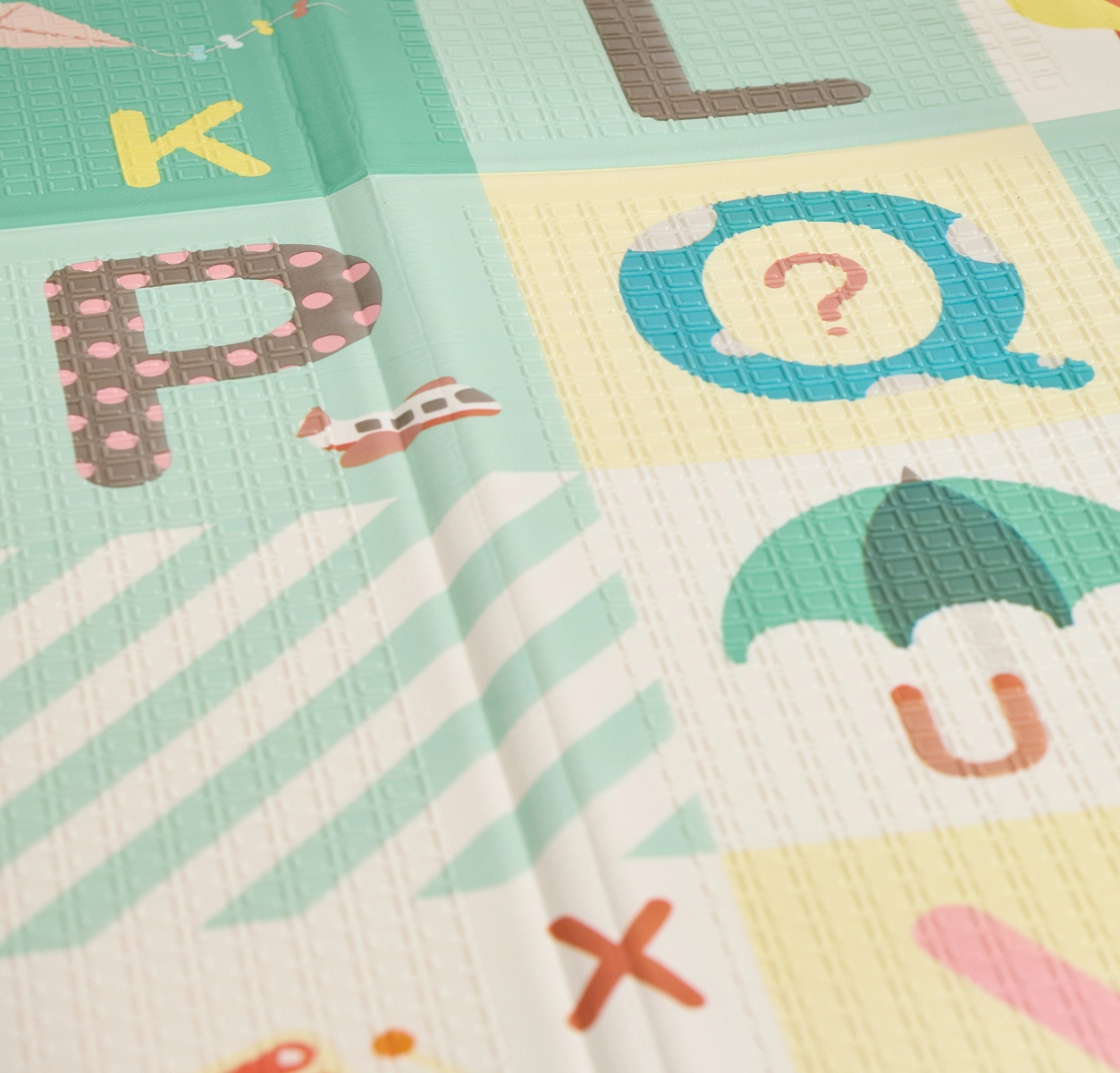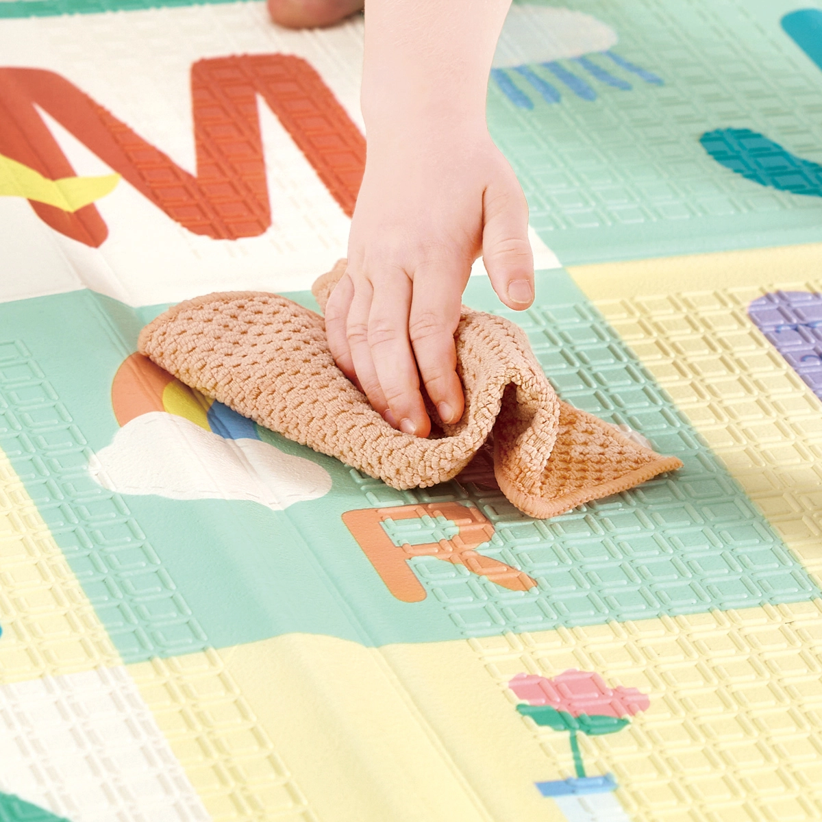 Odkrijte prostorno, mehko in enostavno za vzdrževanje podlogo za dojenčke in malčke. Ponuja veliko igralno površino, barvito abecedo za učenje in na drugi strani merilno lestvico. Je vodoodporna, nedrseča in se hitro zloži za varčno shranjevanje – idealna za vsakodnevno igro, plazenje in počitek.