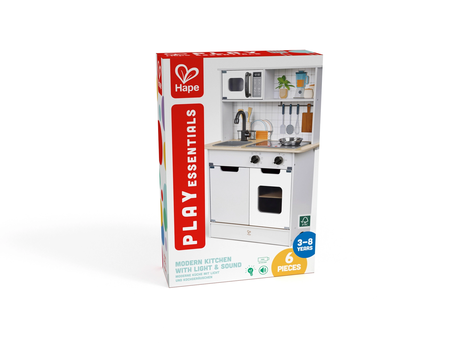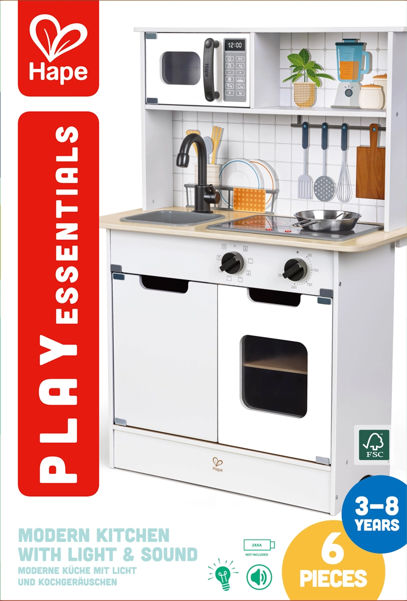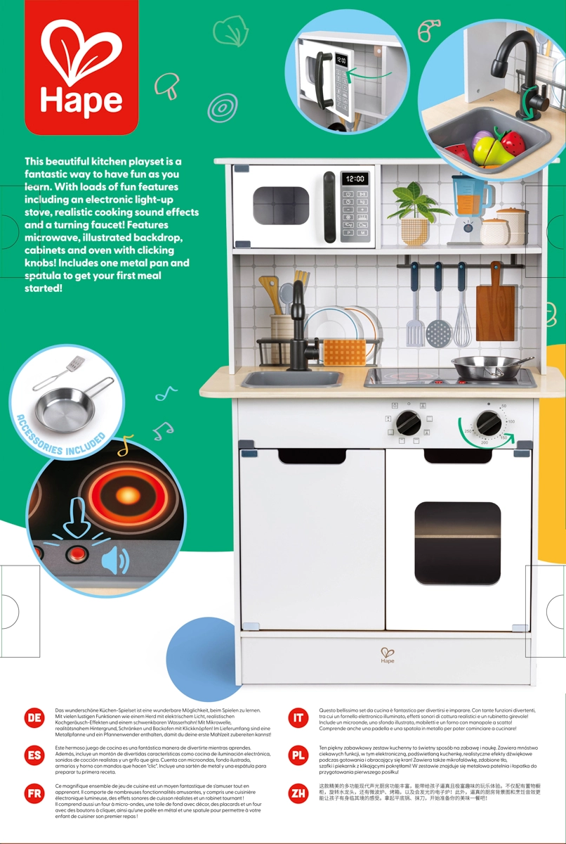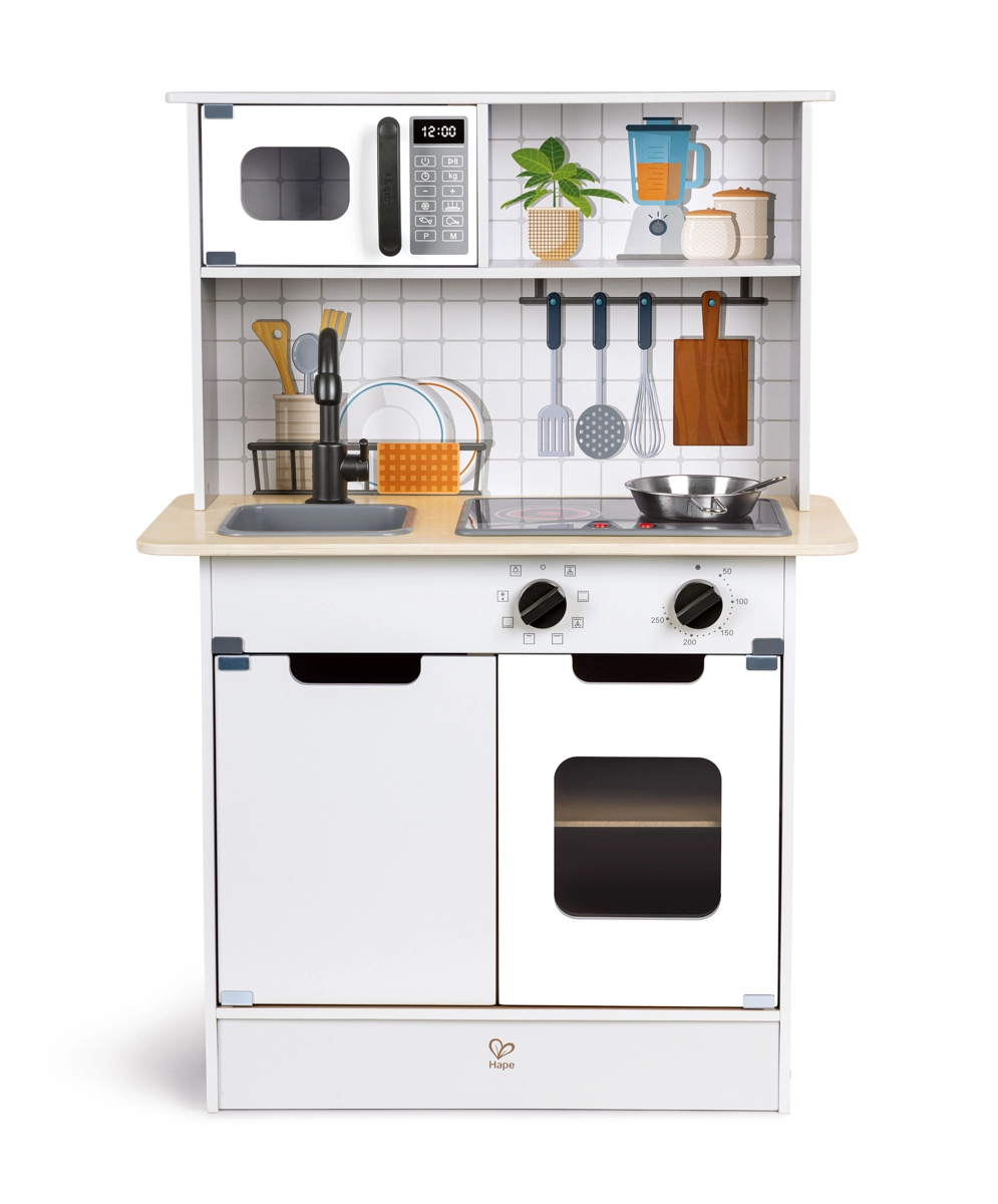 Ta stilska otroška kuhinjica Hape prinaša v sobo moderen videz in avtentične funkcije. Svetloba in zvoki poskrbijo za resnično vzdušje pri igri kuhanja, medtem ko vrtljivi gumbi in odpirajoča se vratca spodbujajo motoriko in domišljijo. Zahvaljujoč trdni izdelavi in varnim materialom se lahko otroci brezskrbno potopijo v igro.