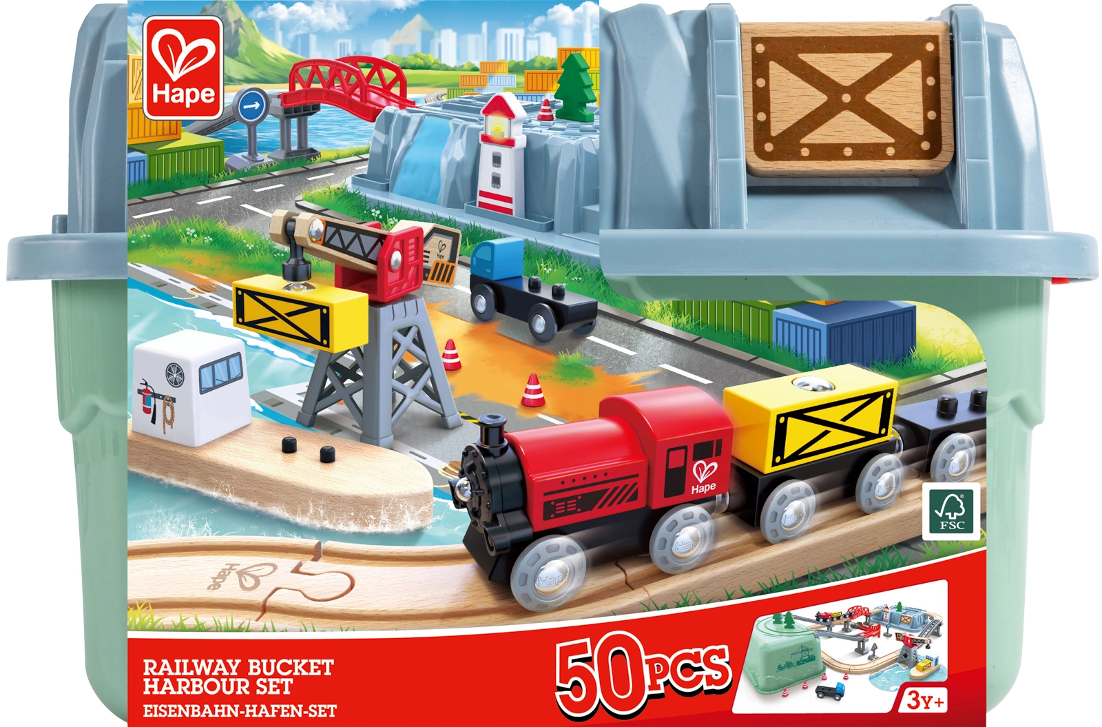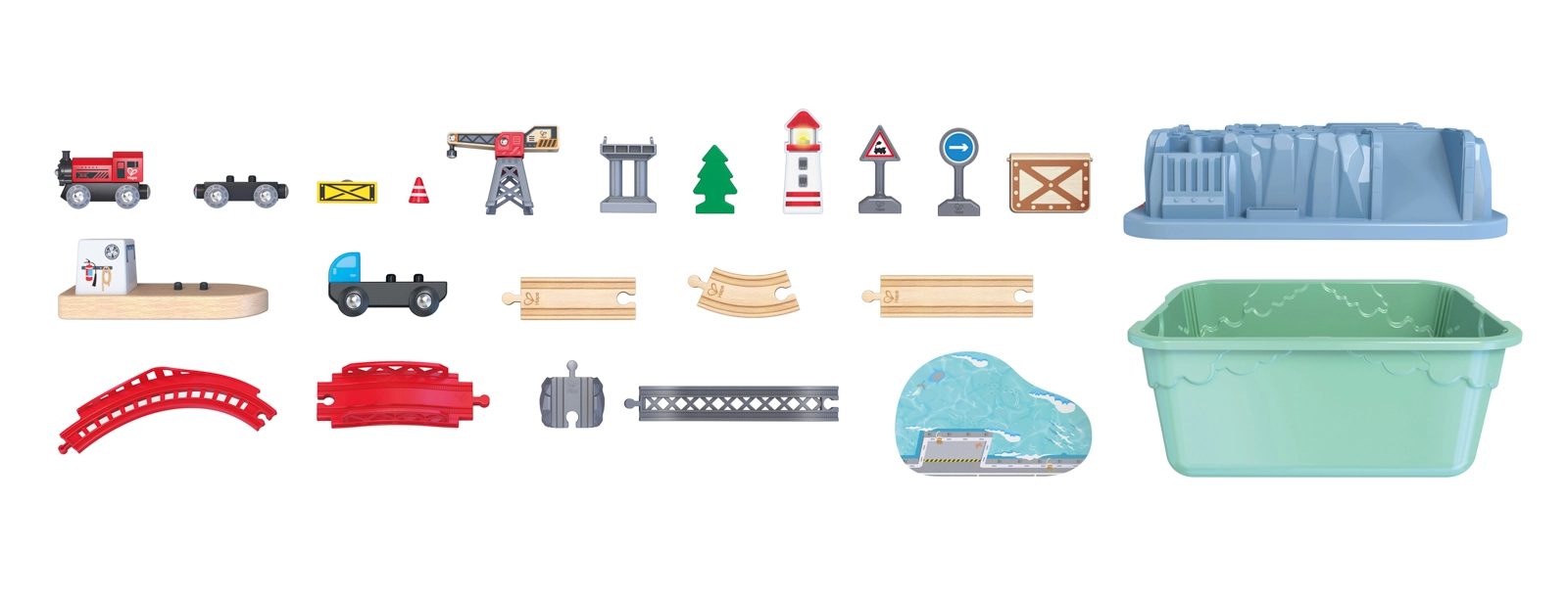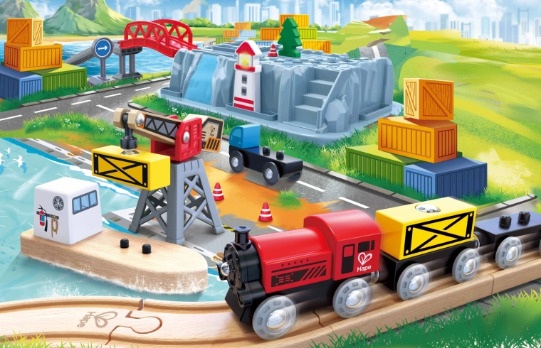 Vsebina vključuje lokomotivo, vagone, žerjav, ladjo pri pristanišču, rdeči most, dvignjene klančine, prometno signalizacijo, drevesa in veliko podrobnosti za dolge ure igre. Združljivost s sistemi HAPE omogoča enostavno razširjanje prog in dodatkov.