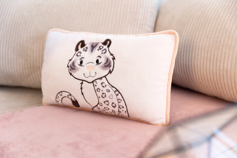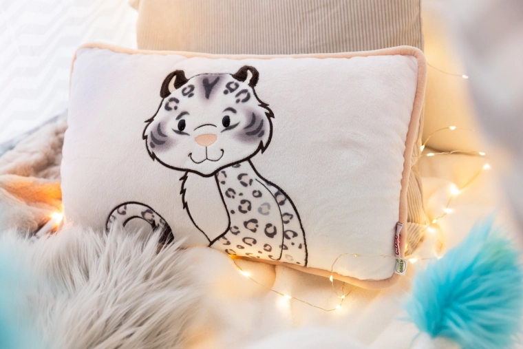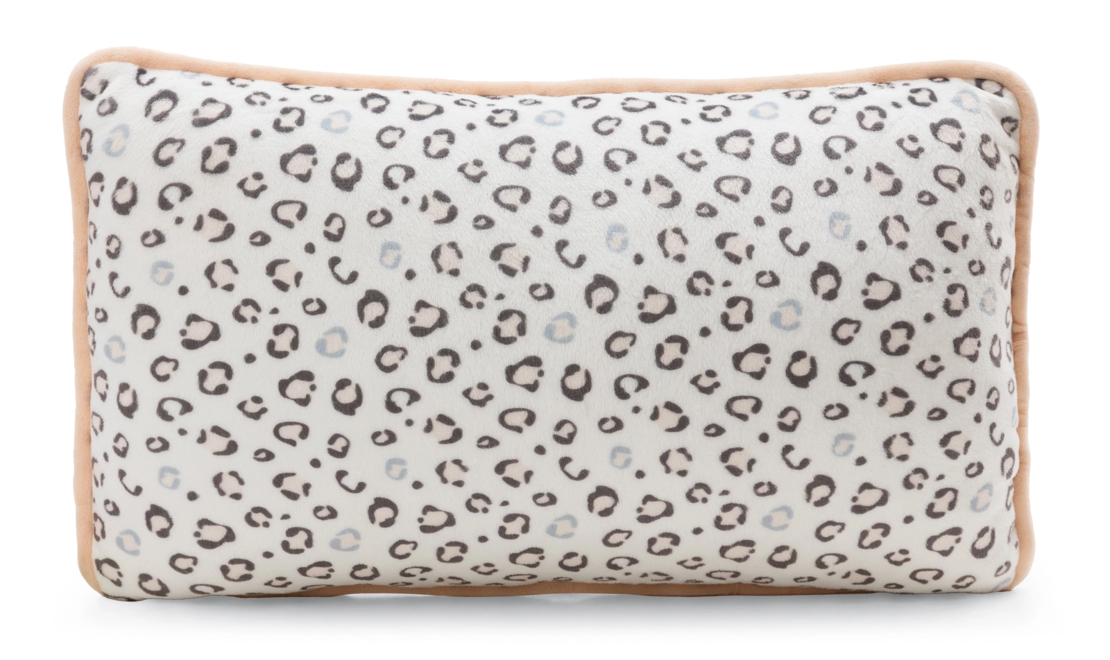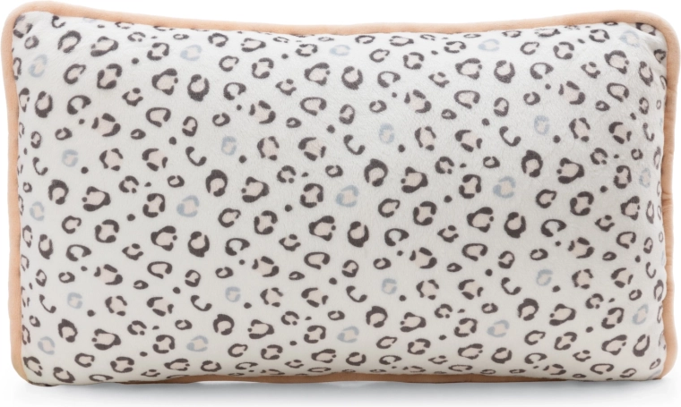 Sprednjo stran krasi ljubka aplikacija snežnega leoparda, zadnja stran pa ima moden leopardji vzorec – idealno za dekor in počitek.