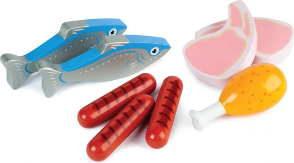 Sveža dostava mesa in rib v leseni škatli z ročaji. Odlična igrača za igro trgovinice ali kuharja; set vsebuje 2 ribi, 2 kotleta, 3 klobase in 1 piščančje bedro. Odličen način, da otroke naučimo o pomenu zdrave in uravnotežene prehrane, pa tudi o tem, od kod hrana prihaja in kako jo pripraviti. Vsak kos je čokat in idealen za majhne otroške roke. Spodbuja ustvarjalno in domišljijsko igro. Izdelano iz kakovostnih materialov iz odgovornih virov. Ustrezá evropskemu varnostnemu standardu. Glavne značilnosti: idealna oblika za majhne otroške roke; spodbuja ustvarjalnost in domišljijo