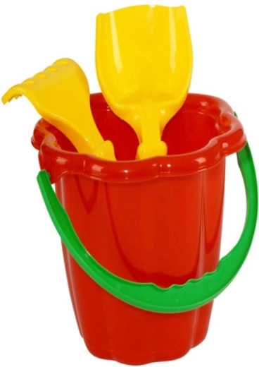 Zabaven in varen komplet za pesek za najmlajše vsebuje plastično vedro, lopatko in grabljice. Primerno za otroke od 1. leta. Na voljo je več barvnih/izvedbenih različic, ki se izbirajo naključno. Cena velja za 1 kos.