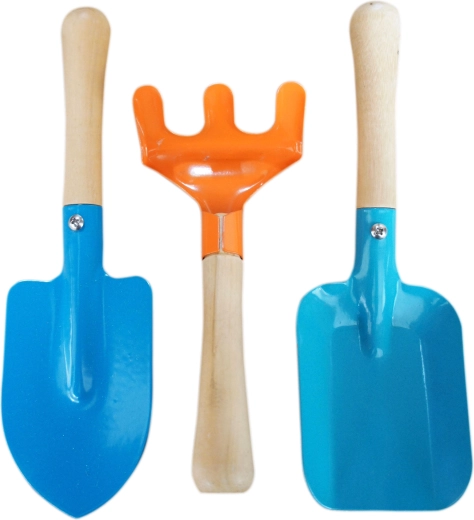 Praktičen otroški komplet vrtnarskega orodja, ki vsebuje grablje, lopatko in motiko. Idealen za prve korake malih vrtnarjev, razvija fino motoriko in odnos do narave.