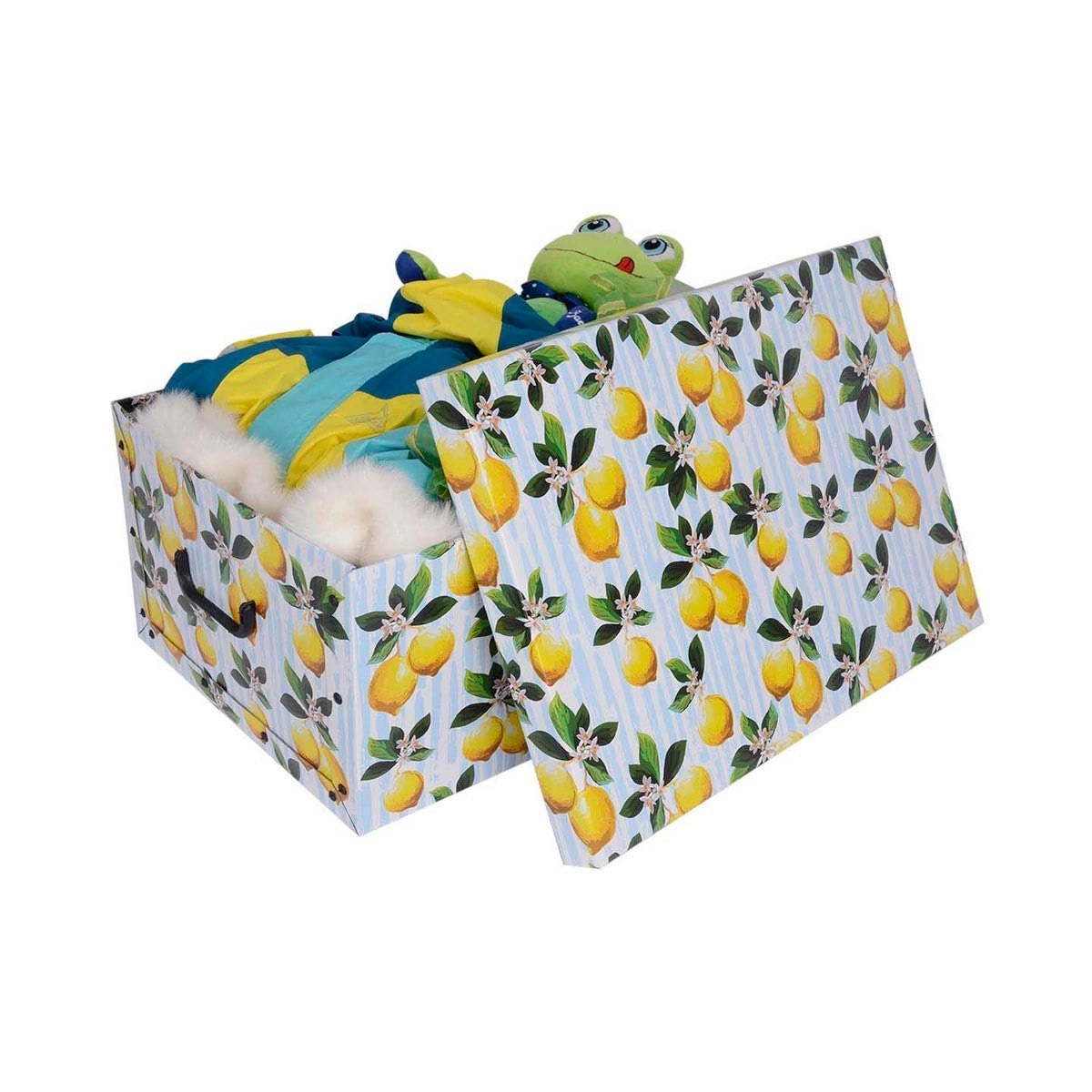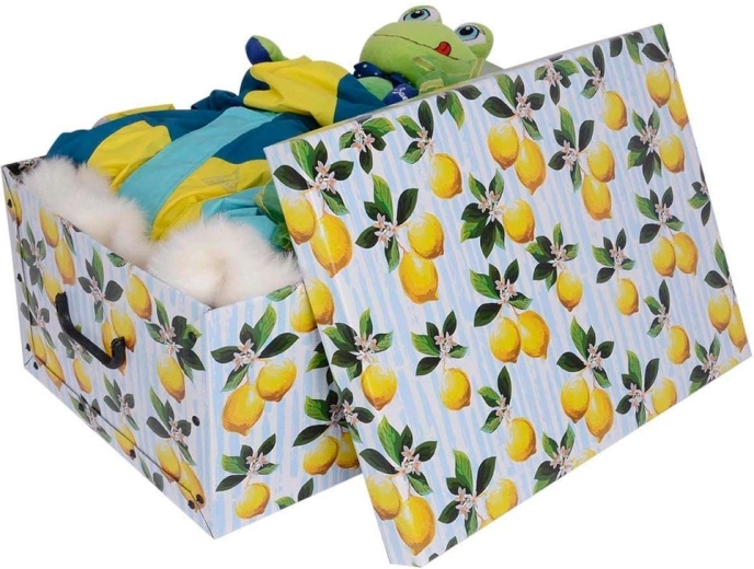 Škatla MAXI je idealna za pregledno shranjevanje oblačil, dokumentov, igrač in dodatkov. Motiv limon doda interierju energijski in svež poudarek, medtem ko kakovostna izdelava zagotavlja dolgo življenjsko dobo in udobno uporabo. Zahvaljujoč ročajem se zlahka prenaša in je primerna za omare, regale ter odprte police.