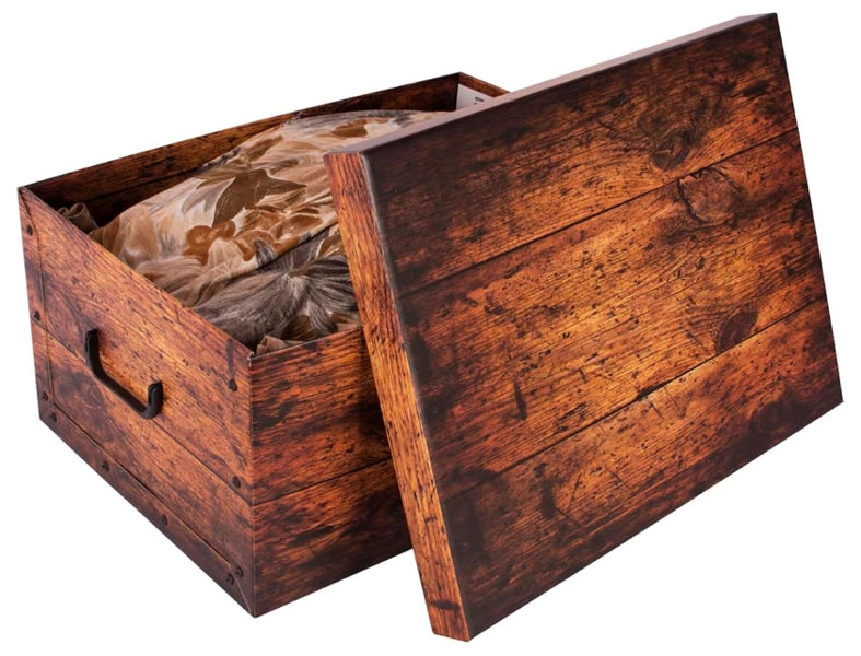 Elegantna shranjevalna škatla v dekorju rustikalnega lesa iz trdega, kašírane kartona iz 100 % recikliranih materialov. Zahvaljujoč pralni površini je preprosta za vzdrževanje, ima čvrste bočne stene, spojene z zakovicami, dvojne zgornje robove in praktične ročaje za udobno prenašanje. Preprosta in hitra montaža, pokrov je pripravljen za takojšnjo uporabo. Izdelano v Italiji.