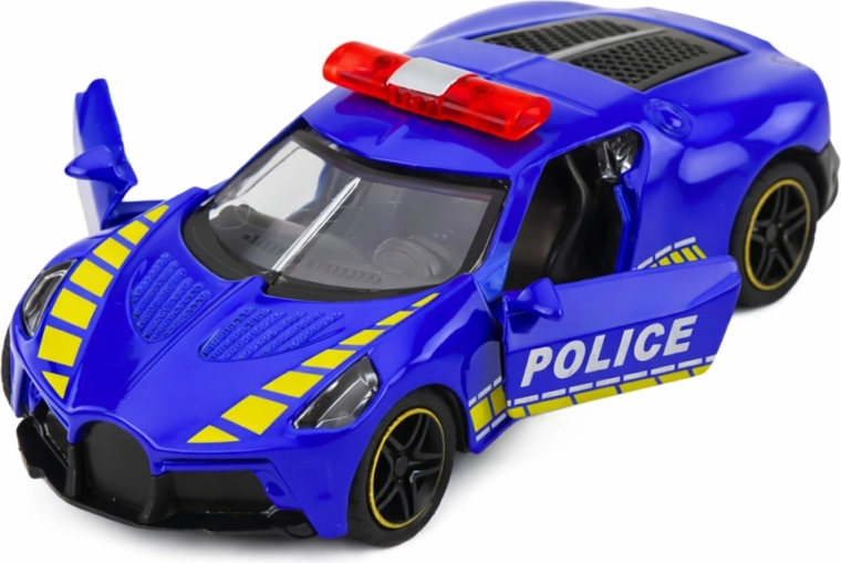 Dodajte otroškim zasledovanjem pridih z kovinskim policijskim športnikom v merilu 1:43. Model ponuja vznemirljivo vožnjo s pogonom pull-back, odpirajoča se vrata za bolj realistično igro in vzdržljivo kovinsko izdelavo v privlačni modri barvi.