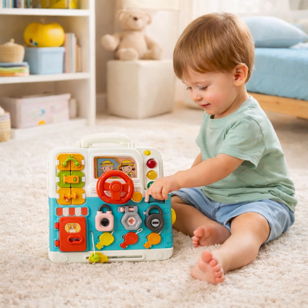 Prenosna interaktivna tabla v obliki zložljivega kovčka razvija otroško motoriko, logično mišljenje in čute. Otroci se igrajo s kolesci, ključavnicami in ključi, stikali, vratci ter posnemajo vsakdanje dejavnosti. Svetlobni in zvočni učinki ohranjajo pozornost ter podpirajo koordinacijo oko–roka in samostojno raziskovanje.