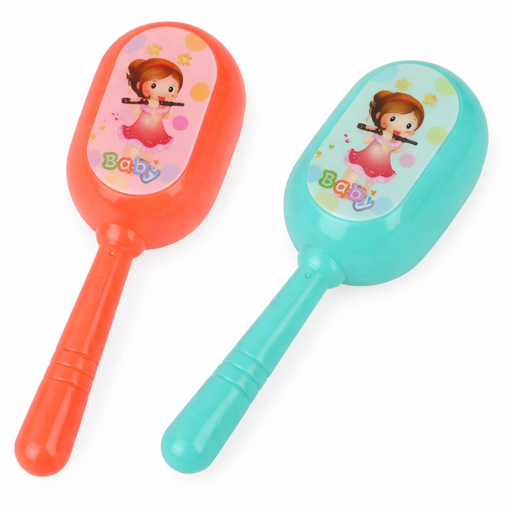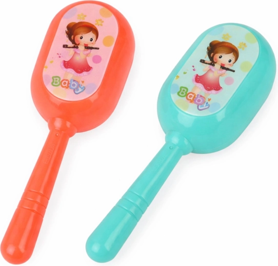 Dve ergonomski ropotuljici se prilegata majhni ročici ter spodbujata občutek za ritem in fino motoriko.