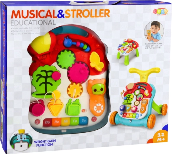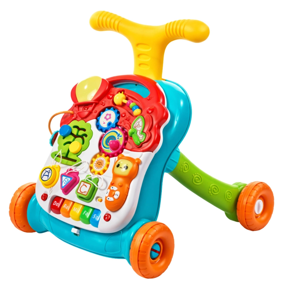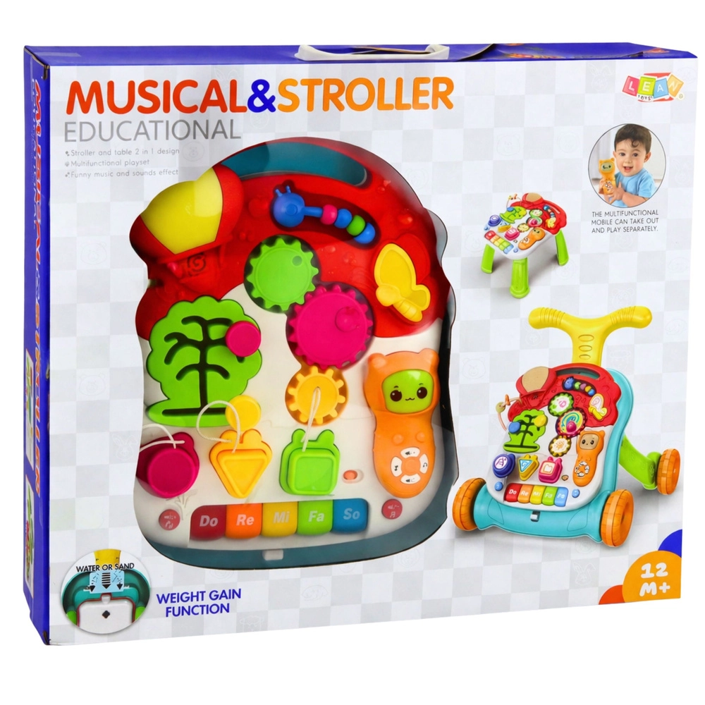 Ergonomski ročaj, gumirana kolesa, ki ne poškodujejo tal, ter čvrsta konstrukcija prinašajo zanesljivost in varnost. Bogata oprema spodbuja samostojno igro ter razvija fino in grobo motoriko, kognitivne veščine in senzorično zaznavanje.