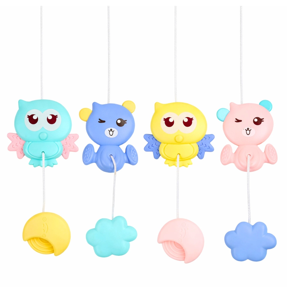 Barvite viseče igrače v obliki živalic pritegnejo pozornost, razvijajo koordinacijo oko–roka, fino motoriko in krepijo mišice. Mehki, netoksični stranski elementi lahko služijo kot grizalo. Univerzalni nosilec zagotavlja enostavno namestitev na večino posteljic z letvicami; po odstranitvi lahko igrače uporabljate tudi v vozičku.