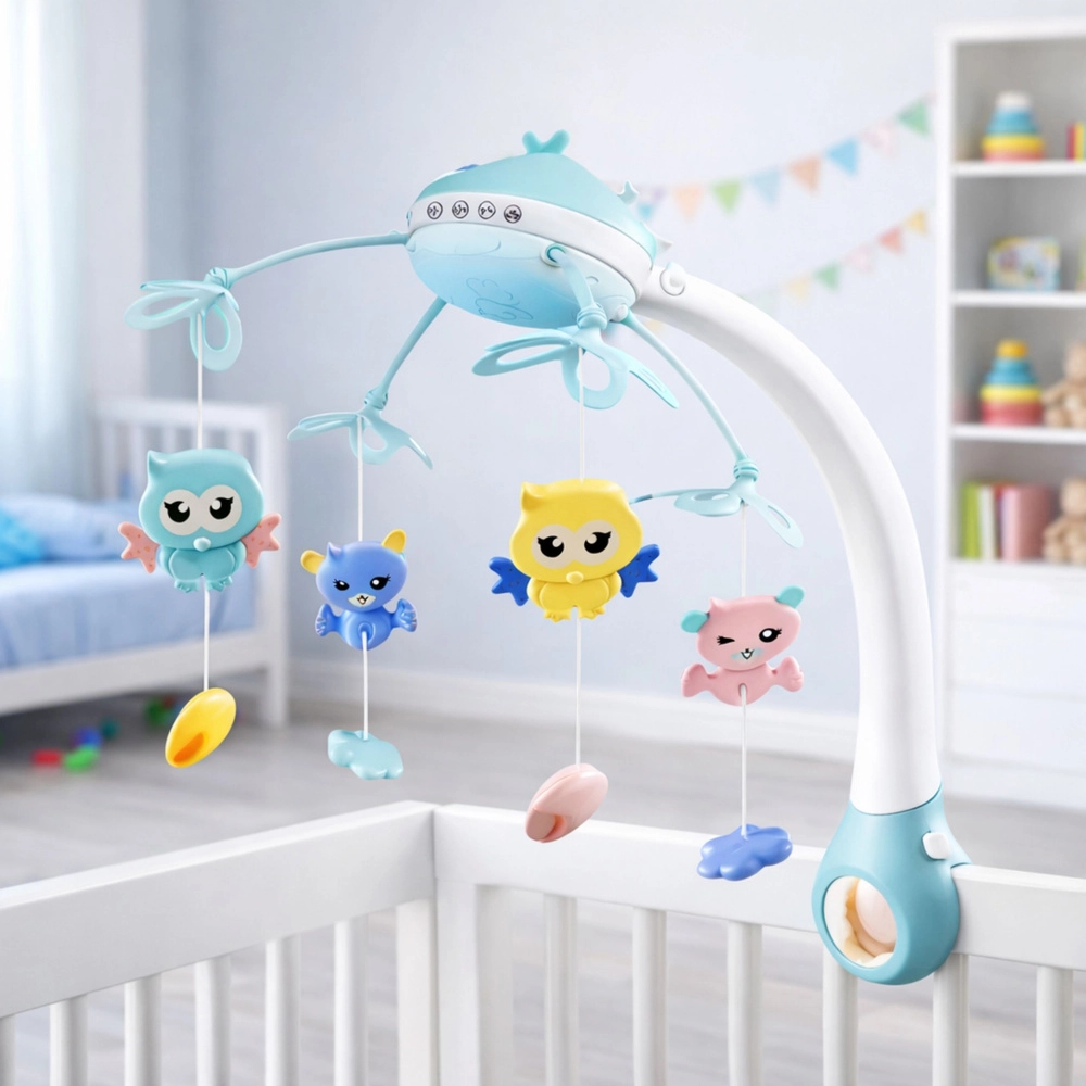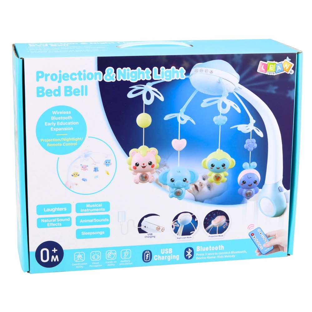Interaktivni vrtiljak nad posteljico je idealen že od prvih dni življenja. Na strop projicira pomirjujoče zvezde in luno, predvaja uspavanke, zvoke živali, inštrumentov ter narave in se nežno vrti. Daljinski upravljalnik omogoča nastavitev vsega brez motenja otrokovega spanca, vključno z nastavitvijo glasnosti in izklopom vrtenja.
