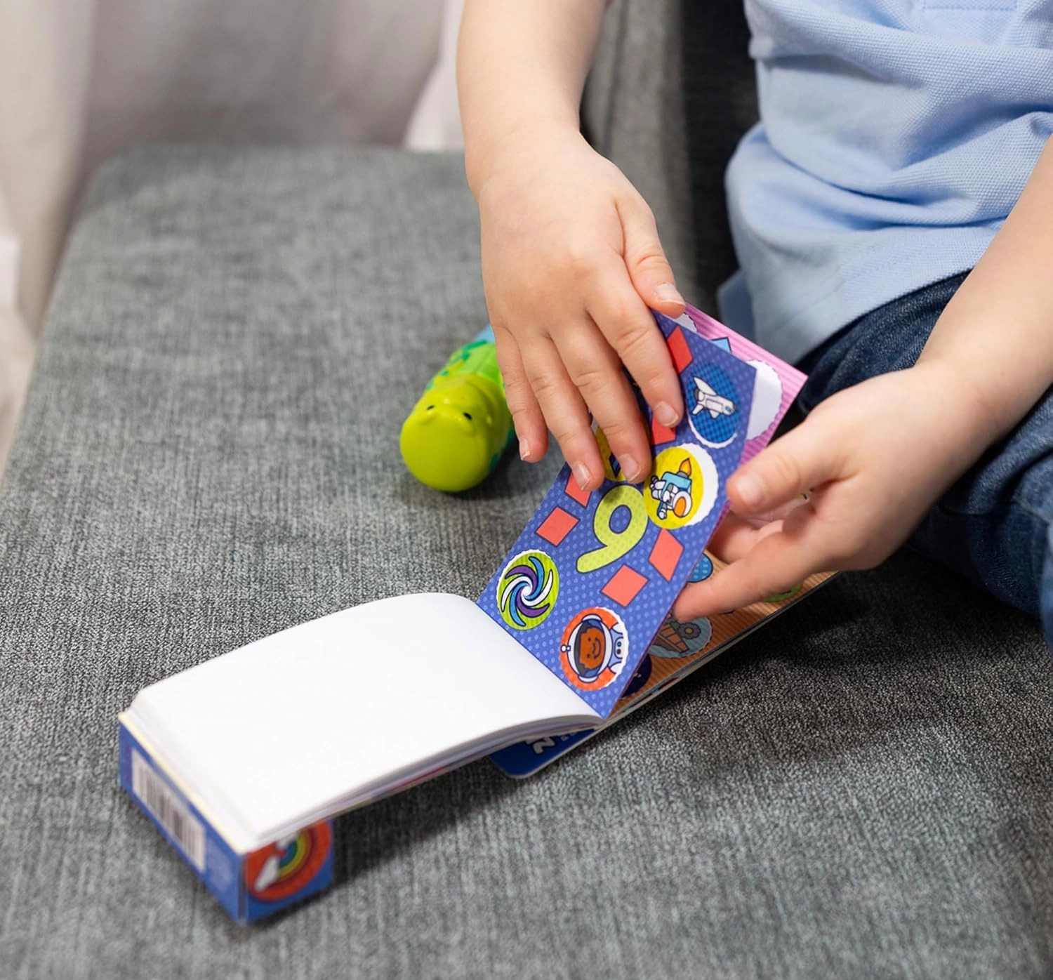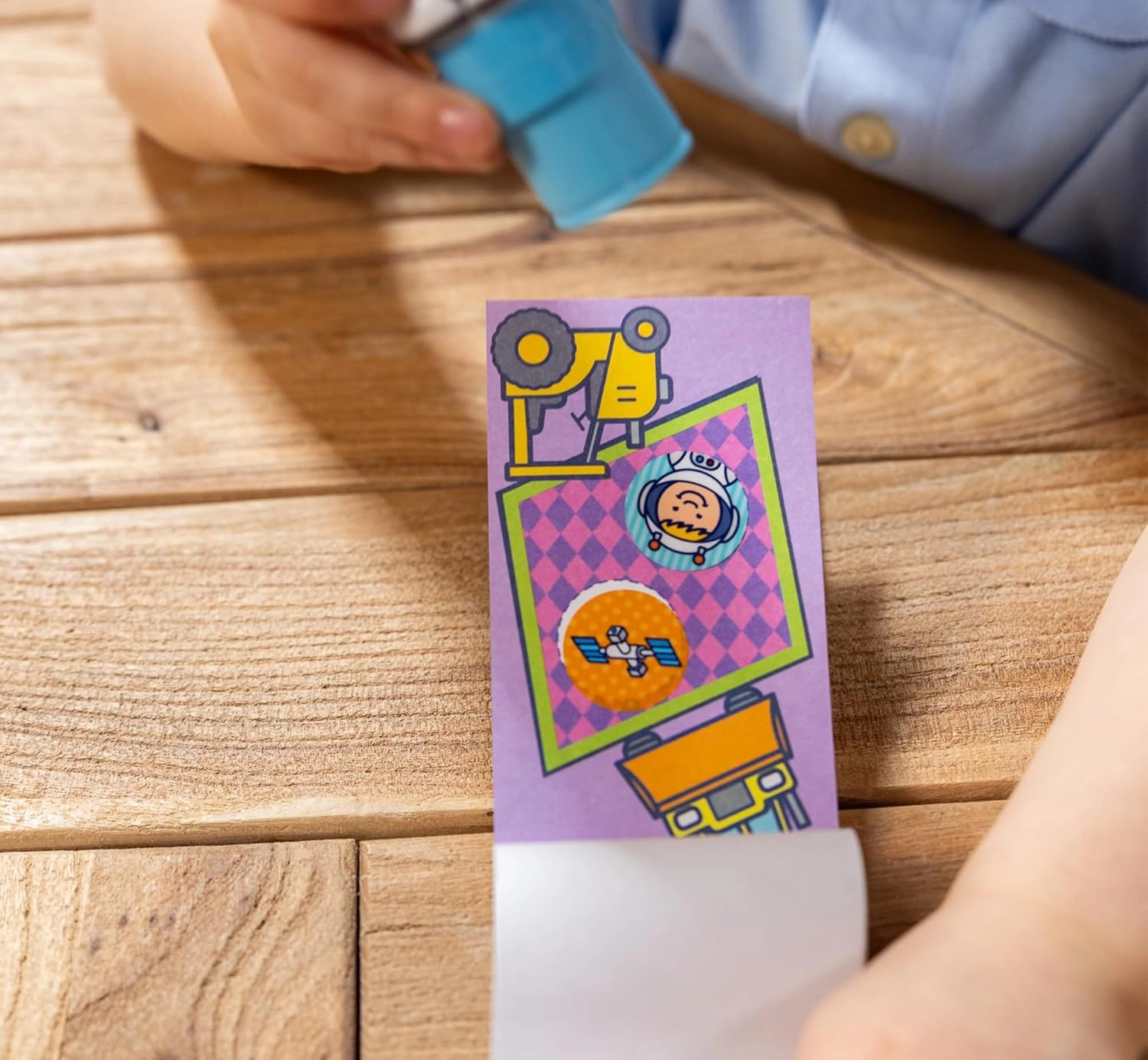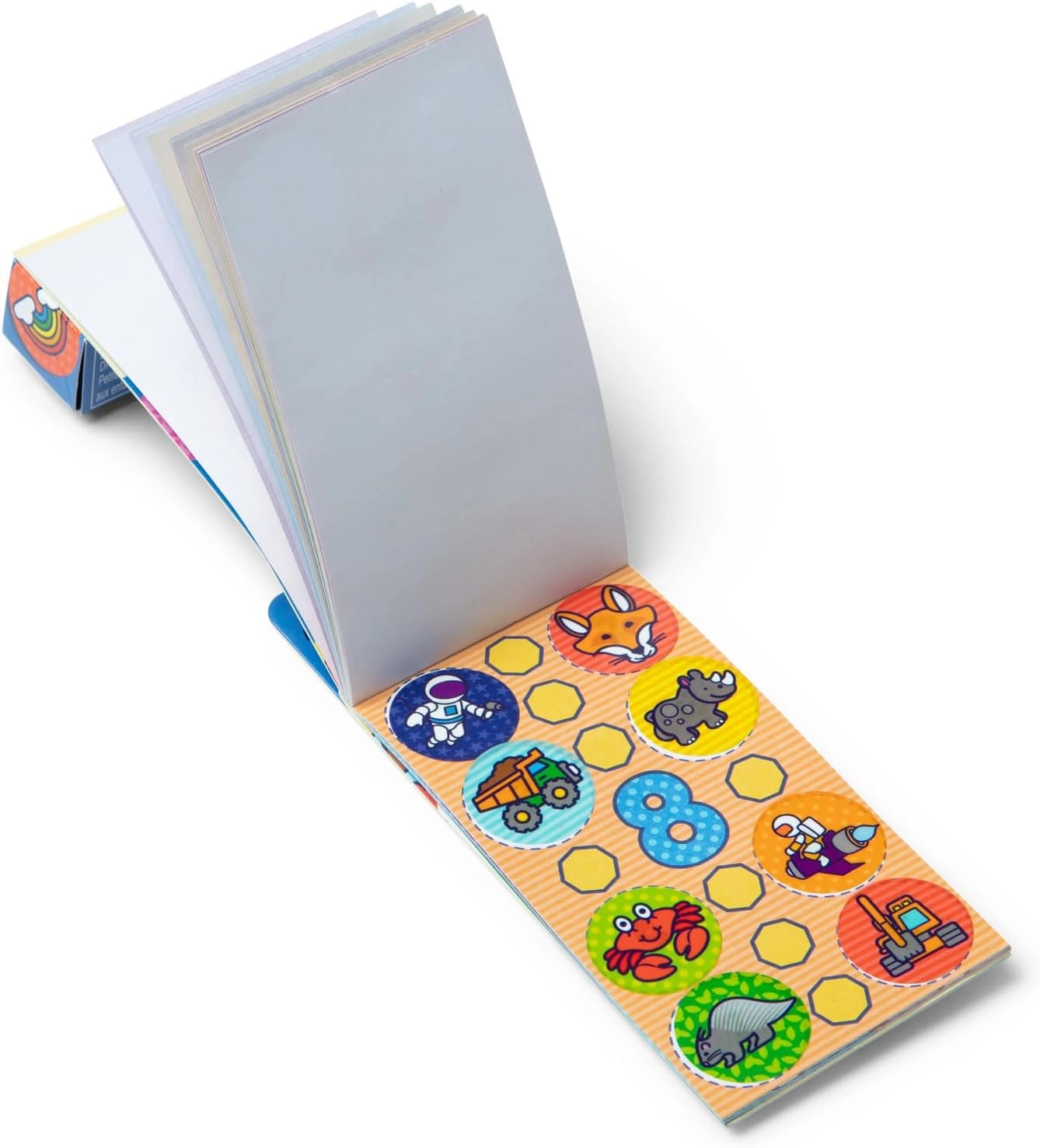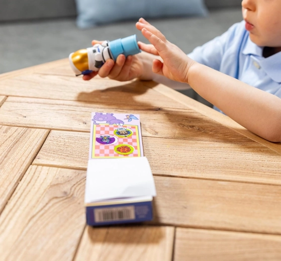 Format, prilagojen otroškim rokam, pregledno shranjene nalepke in čisto ustvarjanje brez nereda.
