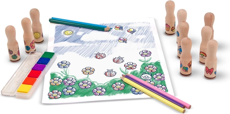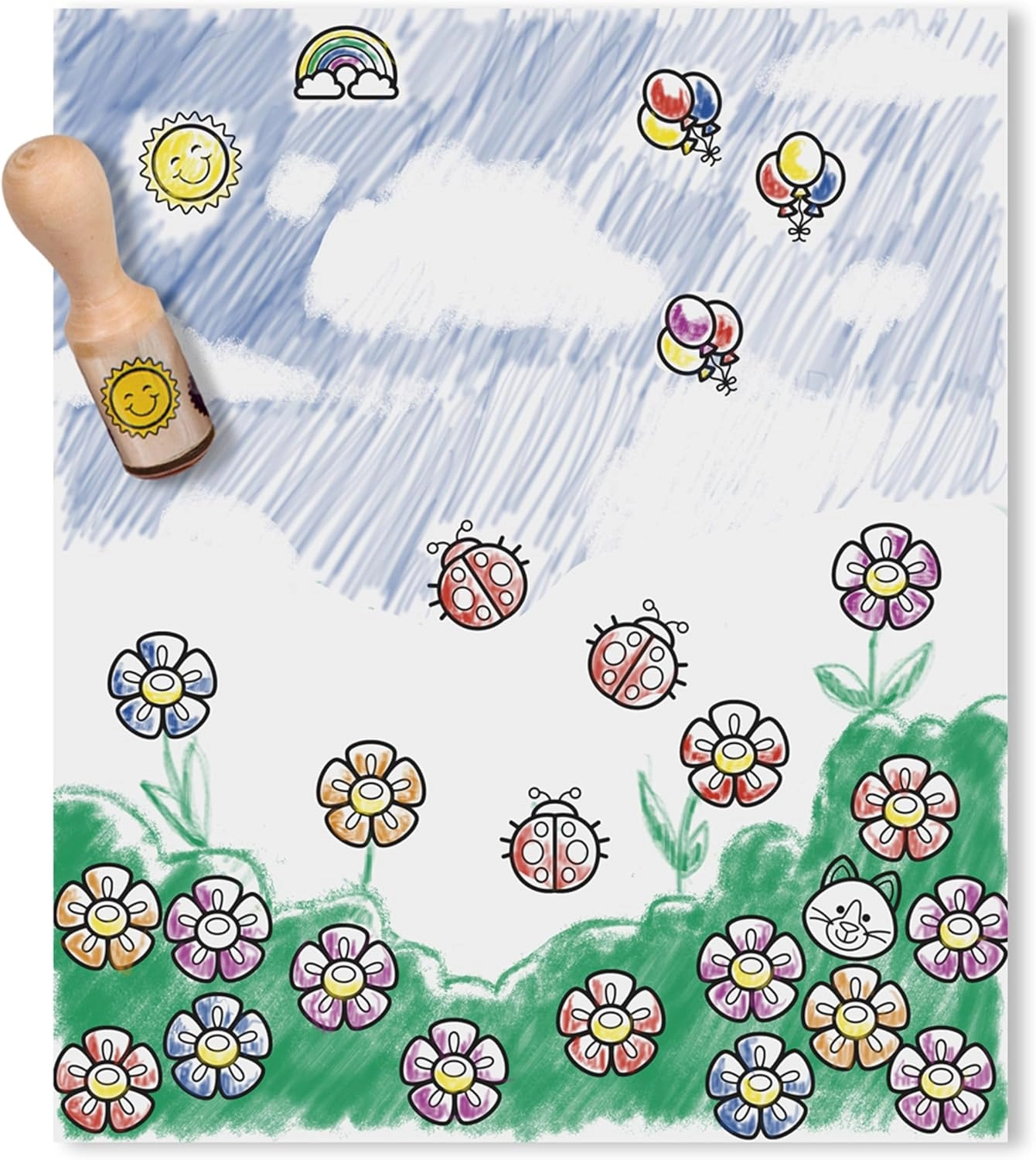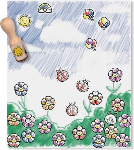 Žigi z motivi sončka, rožic, pikapolonic, mavrice in drugih oblik otrokom omogočajo enostavno ustvarjanje veselih sličic in okraskov.