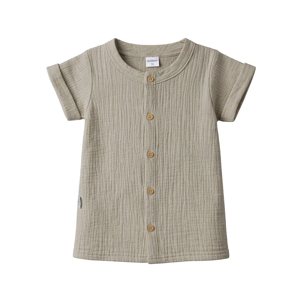 Ta modna muslinasta kompletka NEW BABY je sestavljena iz srajčke s kratkimi rokavi na gumbe in kratkih hlač z elastičnim pasom. Zaradi lahkega, zračnega in mehkega materiala je popolna za poletne dni – otrok ostane v udobju brez tveganja pregrevanja.