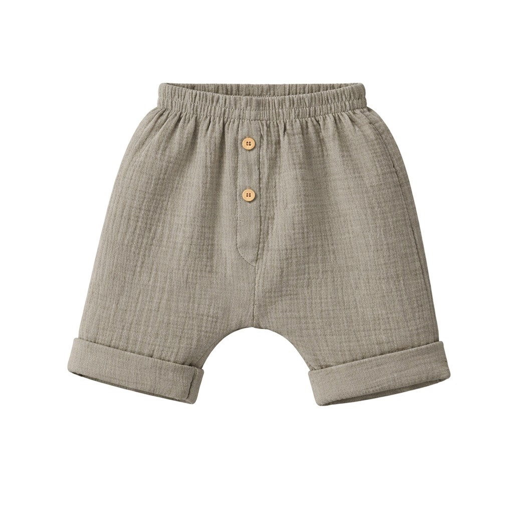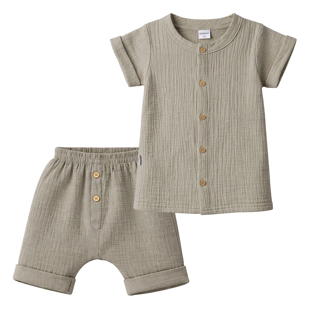 Muslinasto blago je znano po svoji lahki strukturi in odlični zračnosti, ki pomaga ohranjati otroka suhega in udobnega ves dan. Set je barvno nevtralen, enostaven za kombiniranje in zasnovan za svobodo gibanja pri igri.