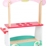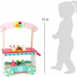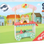 Ta natančno izdelan leseni sladoledni voziček spremeni vsako sobo v igriv slaščičarski kotiček. S štirimi kolesci in udobnim ročajem lahko mali prodajalci odrinejo za strankami kamor koli. Zgornja polica ima pripravljena mesta za vse dobrote, spodnja polica pa nudi dodaten prostor za shranjevanje igrač ali dodatkov.