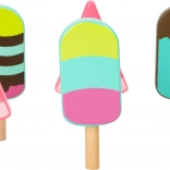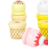 Otroci izbirajo med 12 mikavnimi “okusi” – 6 kepicami sladoleda za kornet in 6 barvitimi lučkami. Korneti s čepkom omogočajo preprosto nameščanje in kombiniranje kepic, kar spodbuja domišljijo in učenje skozi igro. Stojnico je enostavno uporabiti tudi kot mobilno tržnico za prodajo “drugih izdelkov” iz otroškega repertoarja.
