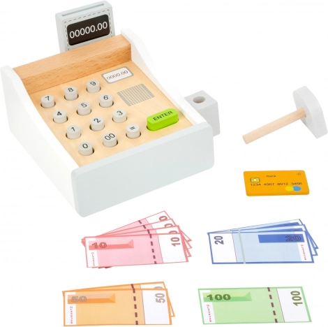 Odkrijte kakovostno leseno blagajno SMALL FOOT, ki na zabaven način uči otroke šteti, prepoznavati cene in uriti socialne veščine pri igri trgovine. Zahvaljujoč realističnim elementom, kot so skener, čitalnik kartic in predal za denar, deluje igra avtentično ter motivira k aktivni in smiselni igri.