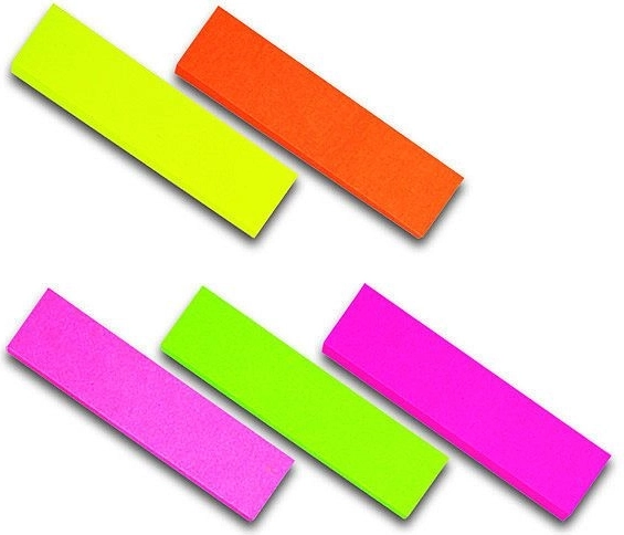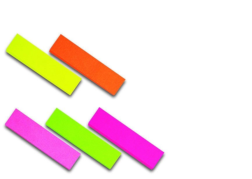 Praktične neonske samolepilne označevalne lističe za hitro označevanje in orientacijo v dokumentih. Pakiranje ponuja 5 izrazitih barv po 100 lističev (zelena, rumena, oranžna, rožnata, temno rožnata). Lističe je enostavno odstraniti brez sledi in se zaradi mere 12 × 50 mm prilegajo tudi na rob strani, zvezkov ali knjig.