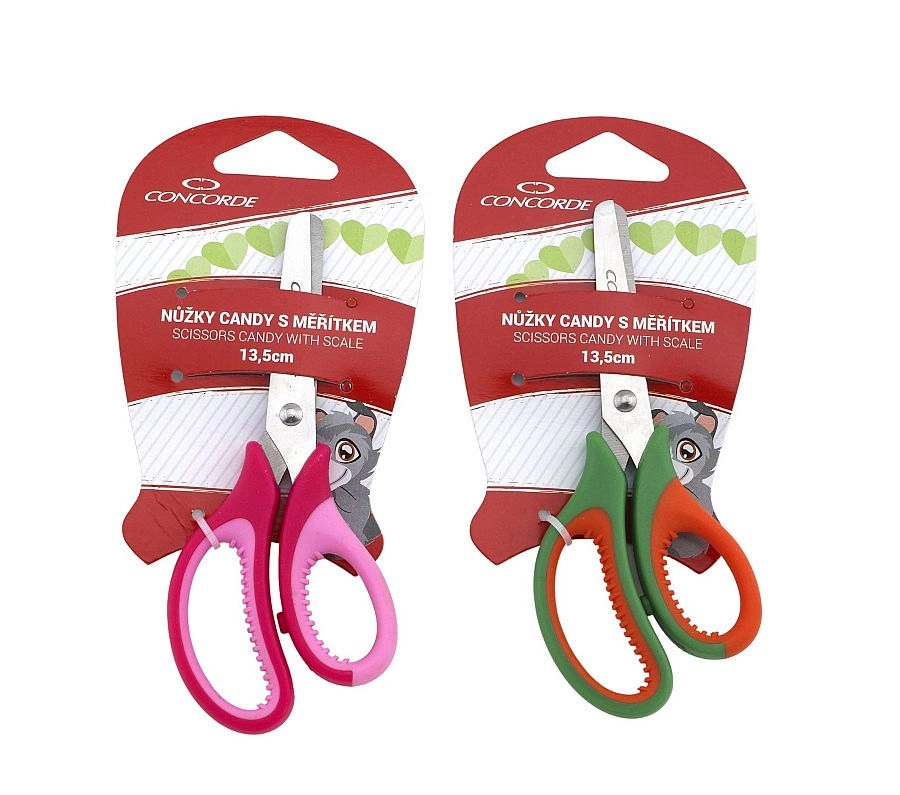 Šolske škarje CONCORDE Candy dolžine 13,5 cm so idealne za otroke in domačo uporabo. Ponašajo se z vgrajenim merilom, udobnim širokim oprijemom in barvnim potiskom v rožnati ali zeleni različici. Dobavljene na blistru za enostavno in varno shranjevanje.