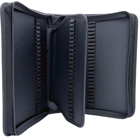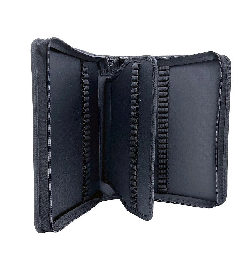 Leva stran vsebuje 25 držal, notranji preklop nudi 2 × 25 držal (na vsaki strani preklopa), desna stran pa doda še 25 držal. Zanesljivo zapiranje z zadrgo med prenašanjem in predstavitvijo varno zadrži vsebino.