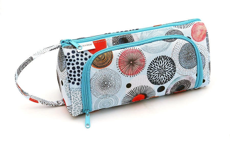 Ob strani je žep na zadrgo s 5 zankami za pisalne potrebščine, zahvaljujoč katerim boste imeli peresa, markerje ali čopiče vedno pri roki. Moderen abstrakten motiv torbici doda edinstven slog in jo lahko preprosto uskladite s šolsko ali delovno opremo.