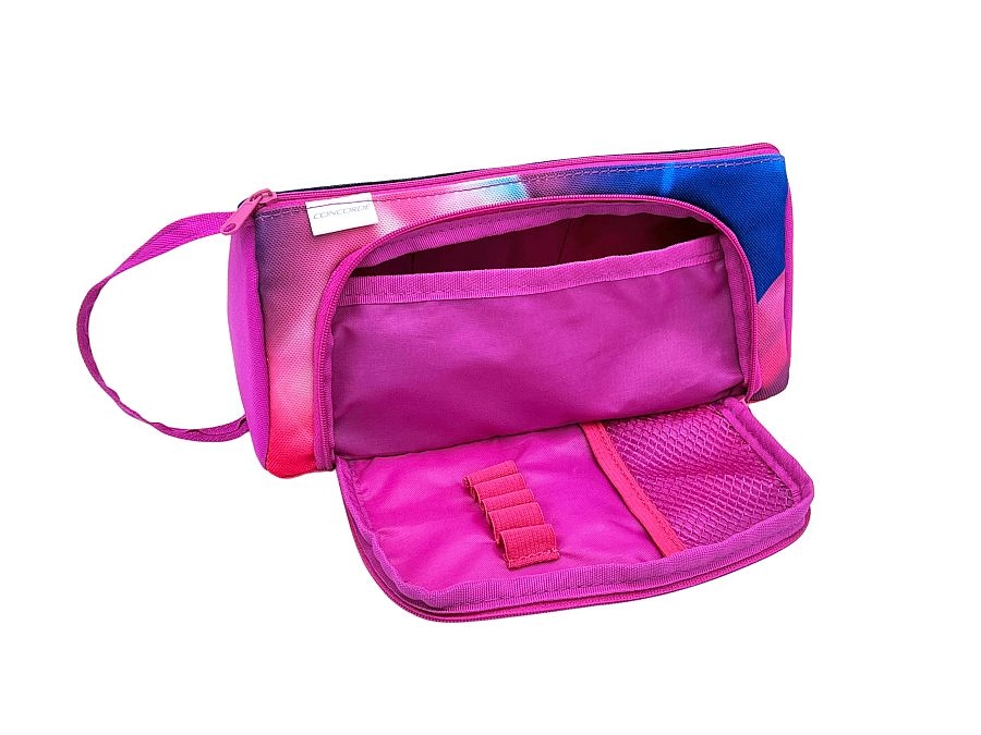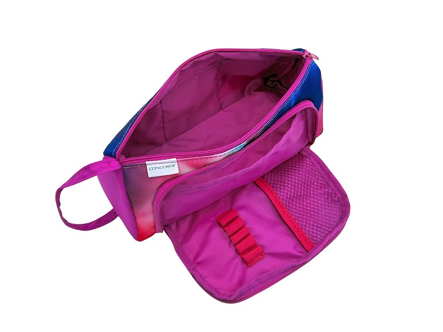 V notranjosti so trije odprti žepki za drobnarije, v stranskem žepu pa je pet elastičnih zank za pregledno shranjevanje pisal, čopičev ali kablov. Trdni šivi in tekstilni material zagotavljajo vsakodnevno vzdržljivost in enostavno nego.