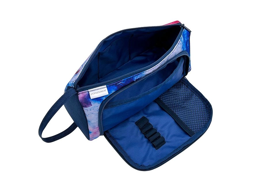 Stranski žep na zadrgo je opremljen z 5 elastičnimi zankami za svinčnike, peresa ali čopiče, tako da imate pomembne pripomočke vedno pri roki. Zaradi univerzalnih mer se torbica zlahka prilega v nahrbtnik ali torbico in je idealna za šolo, službo in potovanja.