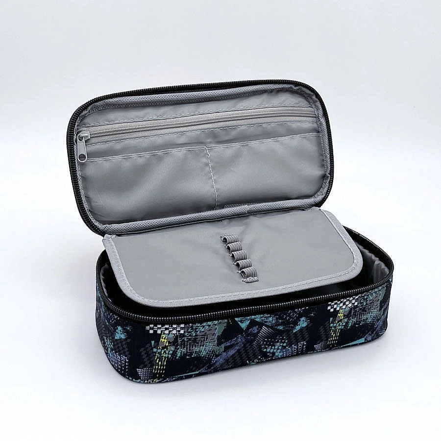 Notranji žep na zadrgo skriva 2 manjša odprta žepka, 1 samostojen žep na zadrgo in 5 elastičnih zank za peresa, označevalnike ali flomastre. Prostran odlagalni prostor sprejme druge šolske nujnosti, kot so ravnilo, škarje ali lepilo.