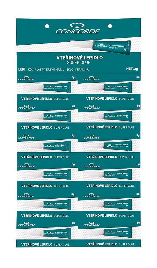 Univerzalno sekundno lepilo CONCORDE, 3 g, za hitra in trdna popravila v gospodinjstvu in delavnici. Primerno za kovino, plastiko, les, gumo, steklo in keramiko. Ponuja takojšen učinek in po strditvi pusti prozoren spoj z trdnostjo do 140 kg/cm².