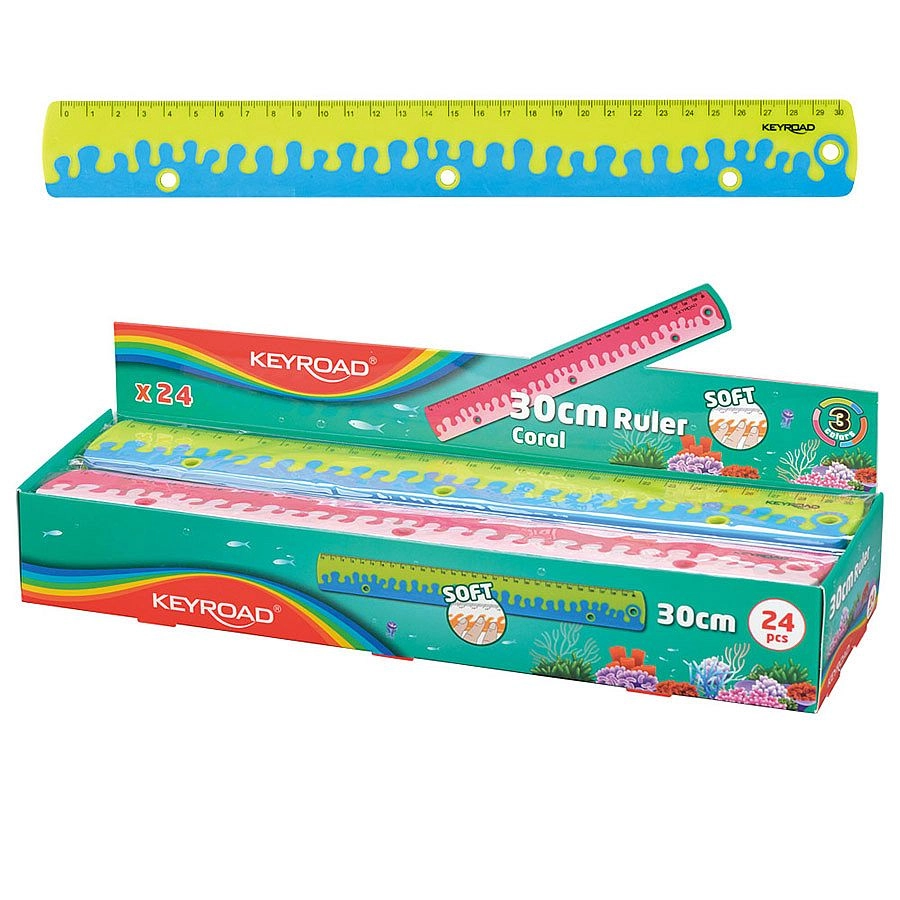 Ravnilo KEYROAD Coral 30 cm je idealna izbira za šolo, pisarno in domače ustvarjanje. Zaradi mehkih gumijastih elementov odlično leži v roki, ne drsi po papirju in olajša natančno risanje.