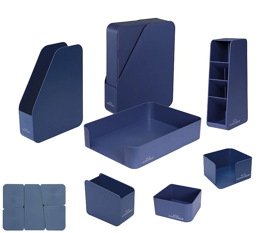 Uredite svojo delovno mizo z elegantnim kompletom CONCORDE Eco iz 7 delov v modri barvi, izdelanim iz recikliranih materialov. Komplet ponuja celovito organizacijo dokumentov in pisal, minimalizem z nagrajeno obliko Red Dot Award 2022 ter odgovorno izbiro zahvaljujoč GRS certificiranemu izvoru reciklata.