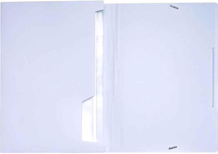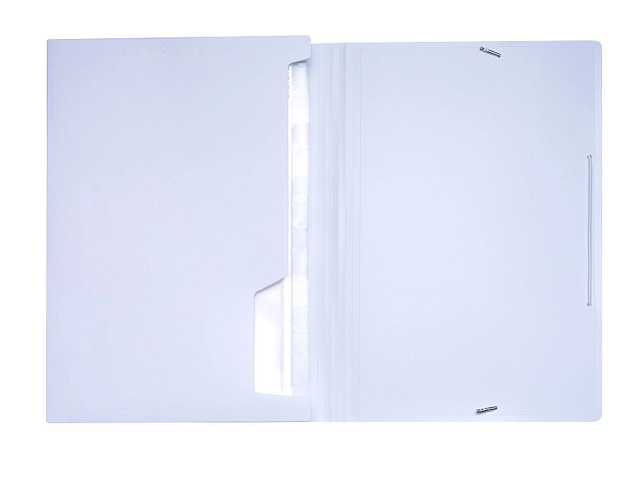 Praktično elastično zapiranje zanesljivo drži vsebino na mestu pri prenašanju in vsakodnevni uporabi. Minimalističen dizajn v beli barvi se odlično poda sodobni pisarni in zagotavlja profesionalen videz vaših gradiv.