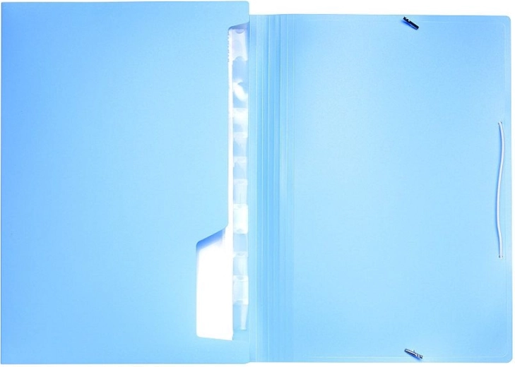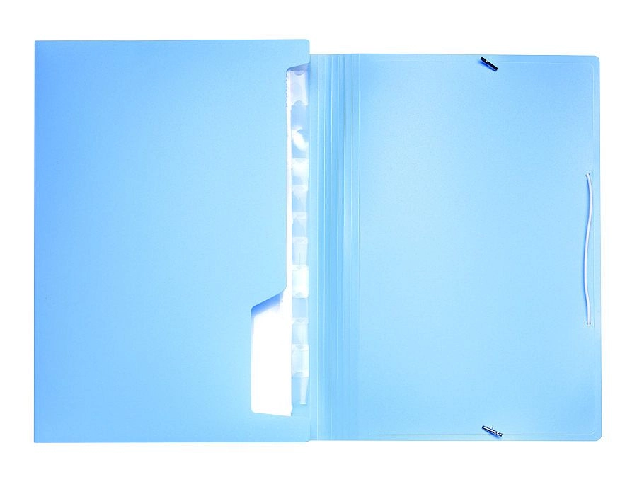 Elegantne mape za dokumente iz odpornega polipropilena v pastelno modri barvi s praktično elastiko za varno zapiranje. Ponuja 13 žepov za pregledno organizacijo dokumentov formata A4 in manjših, vključno z vložnimi lističi za enostavno prepoznavo vsebine.
