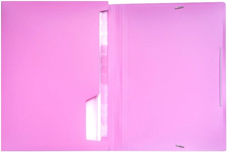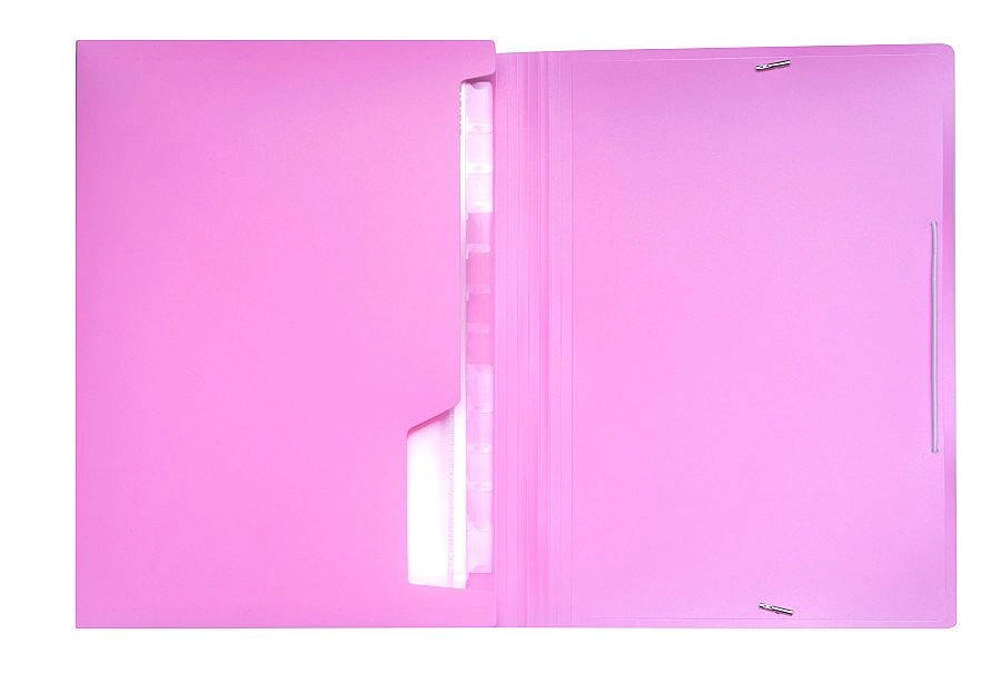 Stilna mapa za dokumente v pastelno roza barvi za pregledno razvrščanje in varno shranjevanje. Ponuja 13 žepov za format A4 in manjše dokumente, vložne oznake za hitro prepoznavo ter zanesljivo zapiranje z elastičnim trakom.