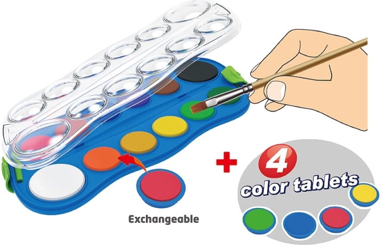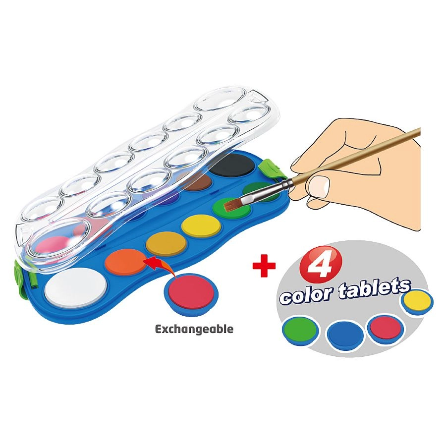 Del pakiranja je 12 osnovnih barv, dopolnjenih s 4 zamenljivimi barvami, ki razširijo vaš nabor možnosti. Barve se enostavno nanašajo, dobro mešajo in so primerne za papir ter likovne tehnike z vodo.