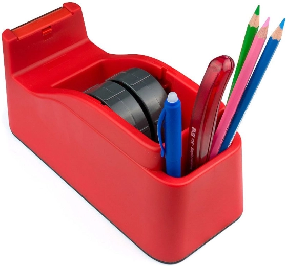 Za natančen in hiter rez skrbi ostro kovinsko rezilo z nazobčanim robom, za katerega proizvajalec nudi doživljenjsko garancijo. Zadnji del služi kot organizator za pisala – svinčnike, kemične svinčnike, škarje ali ravnilo boste imeli vedno pri roki. V pakiranju prejmete tudi prozorni lepilni trak 50 mm × 70 m, tako da lahko začnete takoj delati.