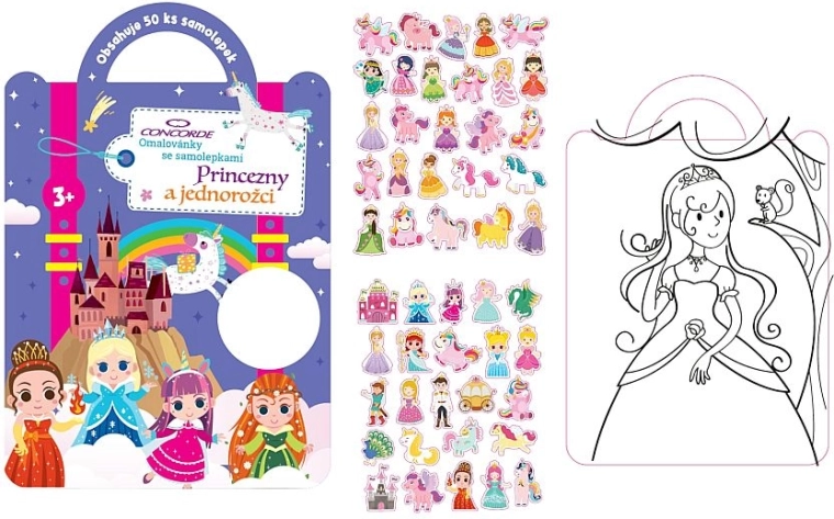 Čarobni komplet za male ustvarjalce: pobarvanke z motivi princes in samorogov, ki jih dopolnjuje 50 samolepk in 20 slik za barvanje. Otroci bodo uživali v ustvarjanju in igri, razvijali domišljijo in ustvarjalnost ter jih bodo lahko zahvaljujoč priročnemu ročaju zlahka vzeli s seboj na pot.