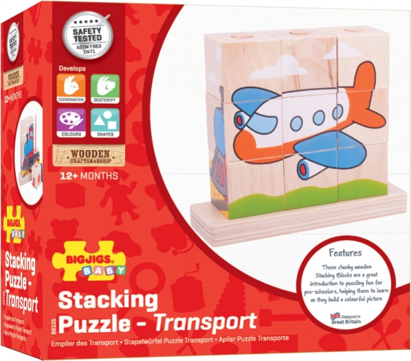 Lesena sestavljanka Bigjigs Baby Prometni sredstva je idealna igrača za razvoj motoričnih sposobnosti in koordinacijo rok in oči pri otrocih. Vsebuje 10 kosov lesenih blokov s četverimi prometnimi prizori: vlak, avto, traktor in letalo.
