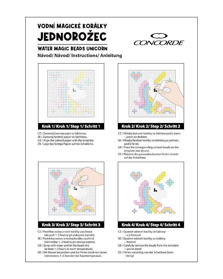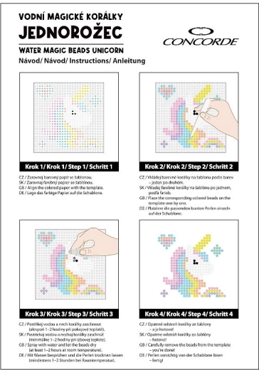 Odkrijte čarovnijo vodnih perlic in ustvarite svojo sliko samoroga brez lepila in likanja. Komplet vsebuje vse za preprosto ustvarjanje – 380 perlic, podlago 11 × 11 cm, držalo za perlice, šablono in razpršilo za vodo. Po popršitvi se perlice samospojijo, zato otroci ustvarjajo varno, čisto in z veseljem.