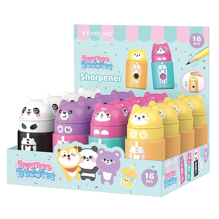 Prisrčno ostrilo z živalskim motivom v pastelnih barvah z eno odprtino in posodico za odpadke je idealno za vsakodnevno uporabo v šoli in doma. Ponuja varno in čisto ostrenje, praktično odpiranje s pritiskom na glavici živali in je primerno za svinčnike in barvice s premerom 8 mm.