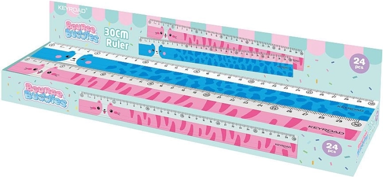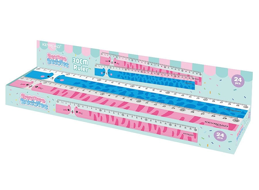 Popestrite šolske potrebščine z igrivim ravnilom KEYROAD z živalskimi motivi. Prosojna izvedba olajša natančno merjenje in poravnavanje črt, medtem ko jasna lestvica do 30 cm zagotavlja zanesljive rezultate pri geometriji in vsakdanjem pisanju.