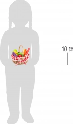 Ta kakovosten set vsebuje pleteno košaro s karirasto tkanino ter lesene kose sadja in zelenjave (jagode, korenje, jajčevec, koruzni storž, jabolko, banana itd.). Deli so povezani z ježkom, zato jih lahko otroci varno “režejo” z lesenim nožem in znova sestavljajo. Odličen dodatek za otroško kuhinjo in nakupovalni stojek.