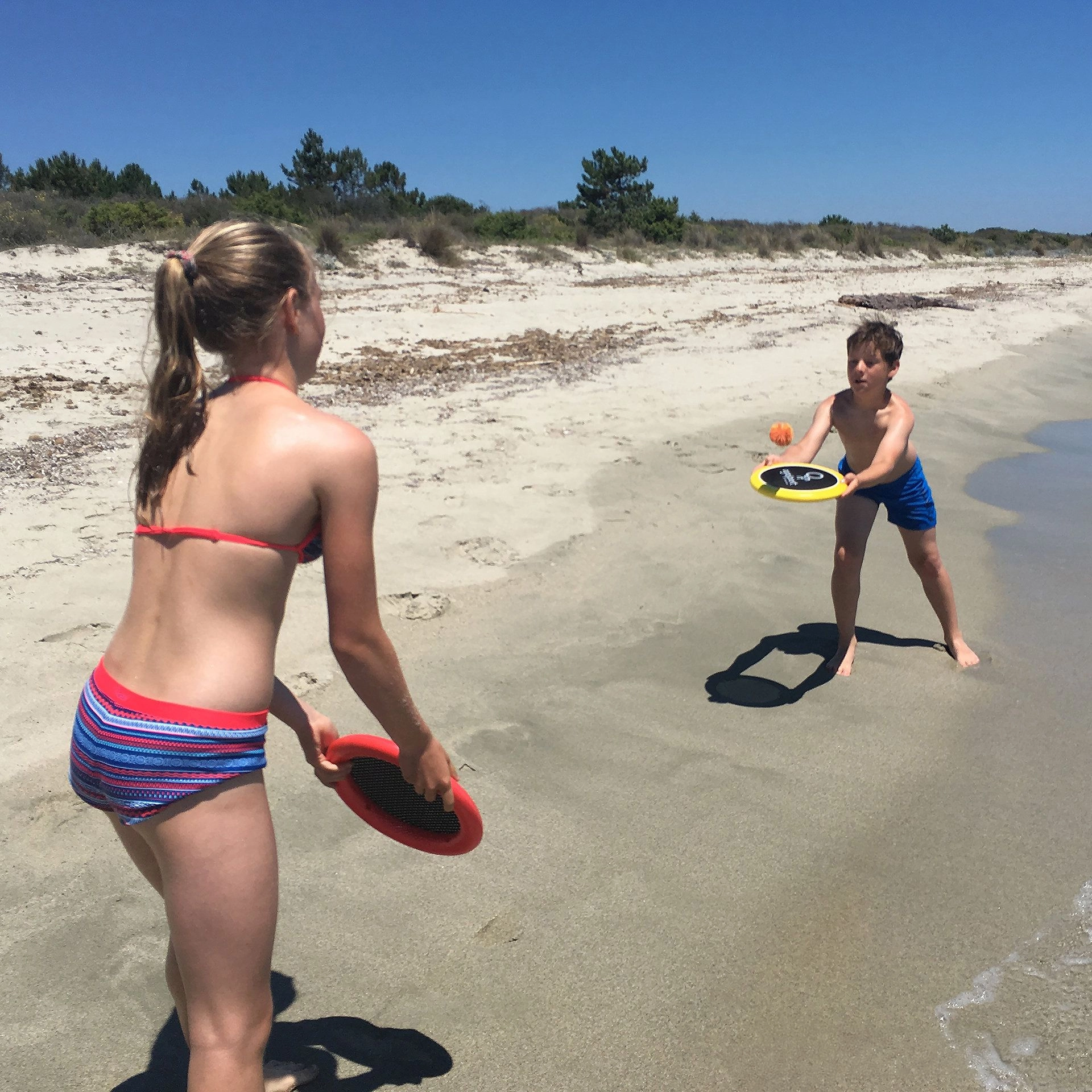 Komplet SCHILDKRÖT OGO SPORT prinaša vsestransko zunanjo igro za otroke in odrasle. Zahvaljujoč vzdržljivi elastični mrežici imajo diski odličen trampolinski učinek, zato žogica leti visoko in daleč, hkrati pa je enostavna za nadzor. Penast rob zagotavlja udoben oprijem in zmanjšuje tveganje udarcev.