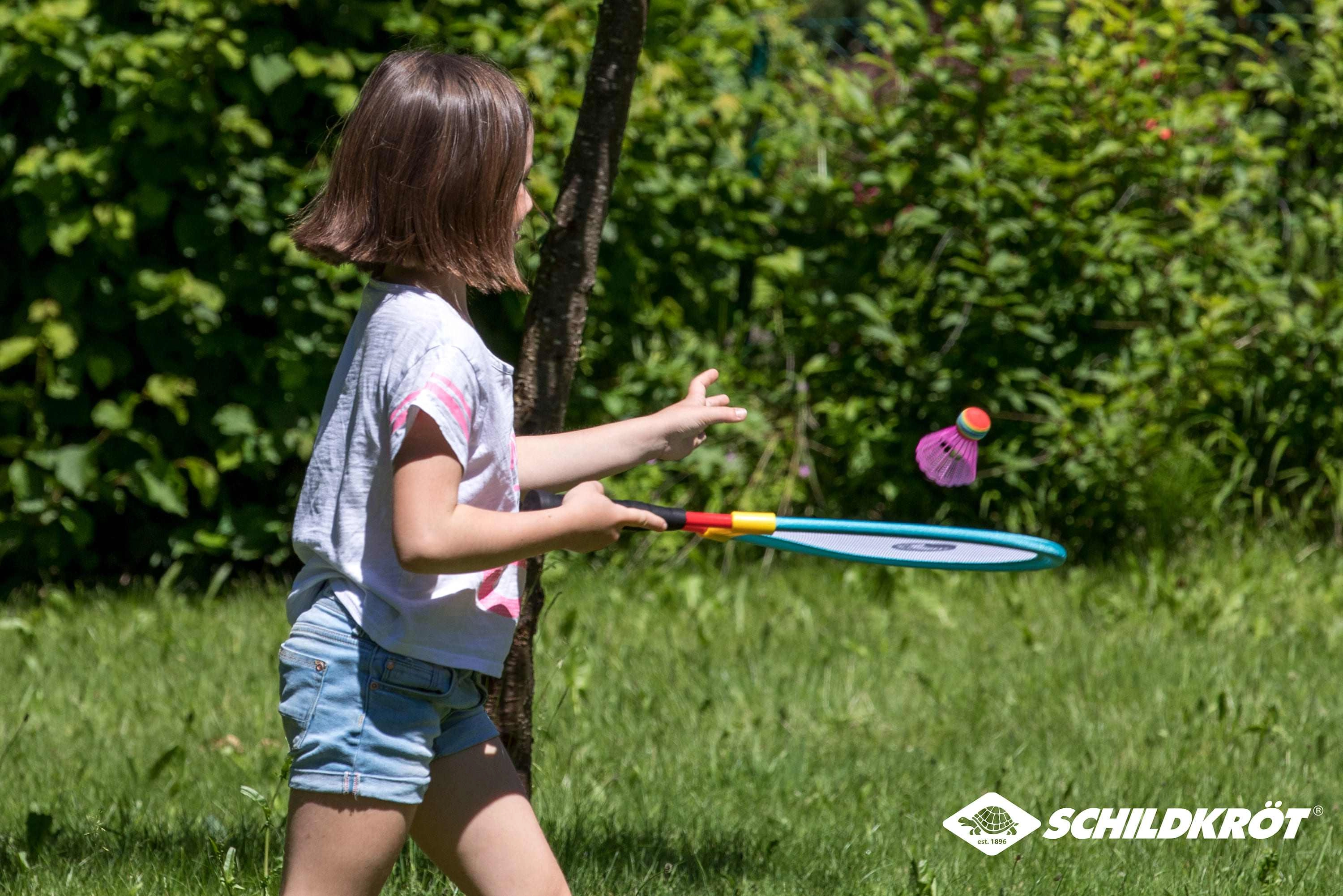 Univerzalni komplet znamke SCHILDKRÖT združuje priljubljena športa z loparjem – tenis in badminton – v eno zabavno igro za vso družino. Zahvaljujoč okvirju z elastično mrežo je za udarec potrebne manj moči, zato je popoln za otroke in začetnike. V paketu najdete 2 velika loparja (62,5 cm), mehak žogico in barvito badminton perjanico za igro na prostem in doma.