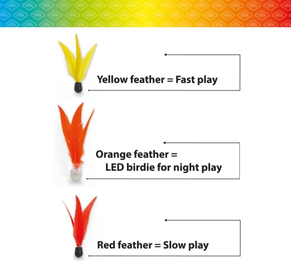 - Rdeča žogica – počasnejši let: nekoliko večja, primerna za krajše razdalje in nadzorovano igro.