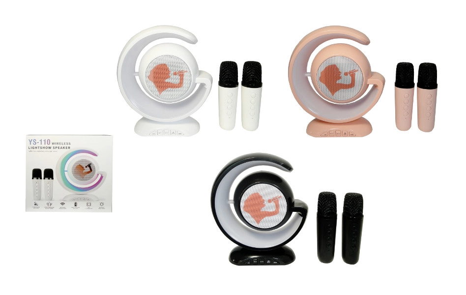 Zabaven brezžični karaoke komplet s polmesečevim zvočnikom in dvema mikrofonoma spremeni vsako zabavo v šov. Ponuja Bluetooth povezavo, svetlobne učinke in polnilno litijevo baterijo v paketu. Na voljo je več barvnih različic (pošiljano naključno).
