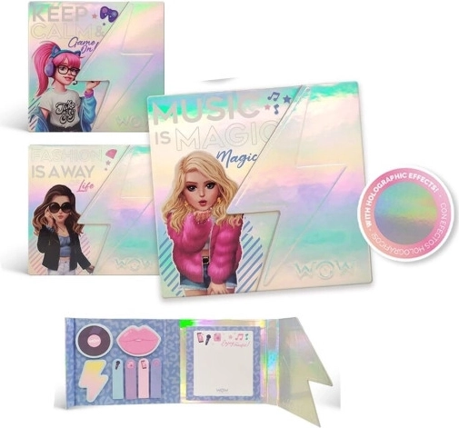Stilska holografska beležnica s samolepilnimi listki in magnetnim zapiranjem za hitre zapiske doma, v šoli in v pisarni. Vsebuje zvezčič in komplet samolepk v različnih oblikah, moderen in eleganten dizajn ter tri motive likov ANNIE, EMMA in VALENTINA. Model je poslan naključno.