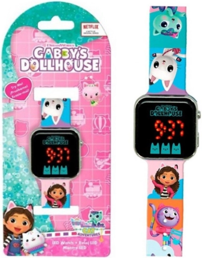 Otroška digitalna ura, navdihnjena s priljubljeno serijo GABIN MAČJI DOM, bo razveselila vsakega malega oboževalca. Barviti pašček in številčnico krasijo priljubljeni liki, zato bo ura postala priljubljen dodatek za vsak dan. Zahvaljujoč preglednemu LED-zaslonu bodo otroci zlahka prebrali čas in se ga na zabaven način naučili pravilno zaznavati.